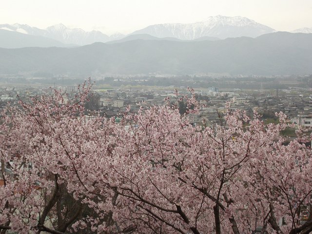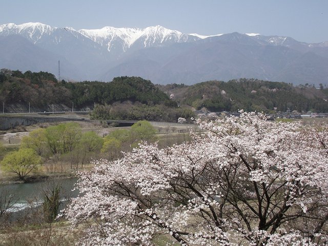| 伊那市・南アルプス仙丈ヶ岳と甲斐駒ケ岳を望む春日公園に咲くサクラ | |