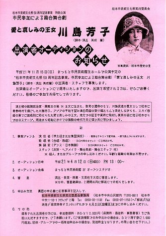 松本市芸術文化祭50周年記念事業 特別公演「愛と哀しみの王女 川島芳子」(脚本・演出 美咲 蘭)の出演者・スタッフ募集の案内がありましたので紹介しておきます。