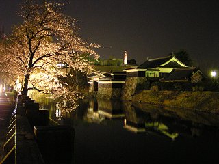 | 松本城外堀沿いに咲く桜並木のライトアップ |