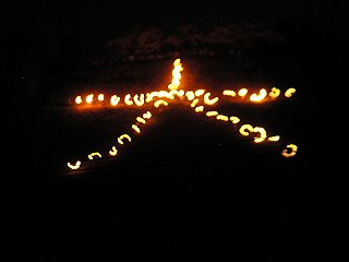 市重要無形民俗文化財に指定されている「島内の鳥居火(とりいび)」は、五穀豊穣・家内安全を願う島内地区に伝わる伝統行事。鳥居火山の西斜面に立った住民たちが、手にした松明で「鳥居(の形)」や文字を描き、地区の大宮・武宮両神社に奉納します。行事は14日から16日までの連続3日間、午後8時から花火の合図で行われることになっていますが、今年は初日の14日が大雨となったため延期され、翌15日の午後7時30分から前夜担当する予定だった町区が行ない、続いて午後8時から当日担当の東方(ひがしかた)区が斜面に文字を描きました。最終日の16日は、担当する北方(きたかた)区が午後8時から行い、3日間の行事を締めくくりました。 (写真:島内保育園から撮影した町区住民が描く「大」の文字=15日午後7時31分撮影)