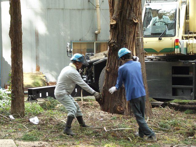 おそらくタッキーさんでしたら、こうした伐採の方法についてお詳しいことと思いますが、なにしろ縁遠いひろさくには、こんな狭いところでしかも30mもあるような長い木をどうやって切り倒すのか、もう興味津津で、職人さんたちの手際良い作業に感心するばかりでした。