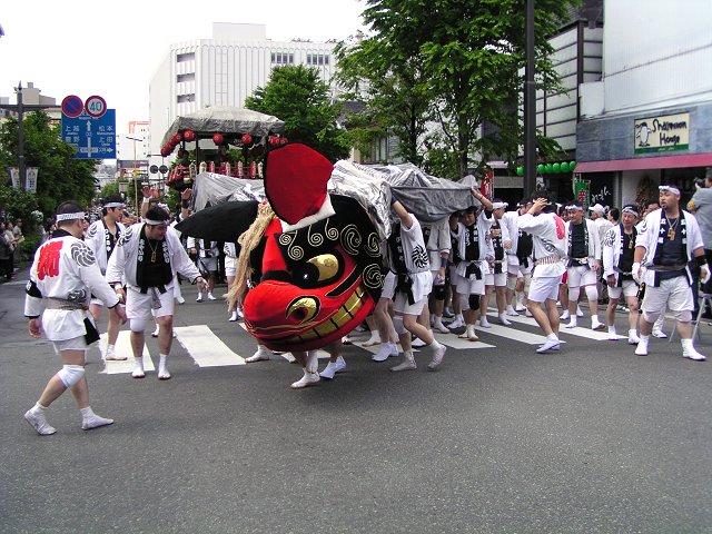 午後1時に市内末広町を出発した行列は、マーチングバンドの演奏を先頭に大獅子・山車の順で進み、午後4時半に善光寺山門に到着。午後5時25分から奉納舞が行われることになっています。 (写真:篠ノ井大獅子=10日午後撮影、640×480拡大可能)