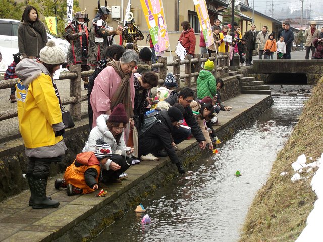 (写真:竹山川で行われた「流しびな」=2日午前撮影、640×480拡大可能)