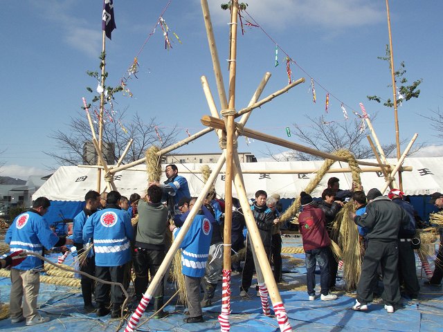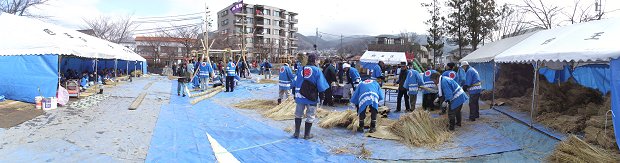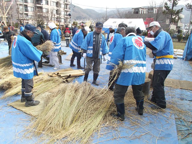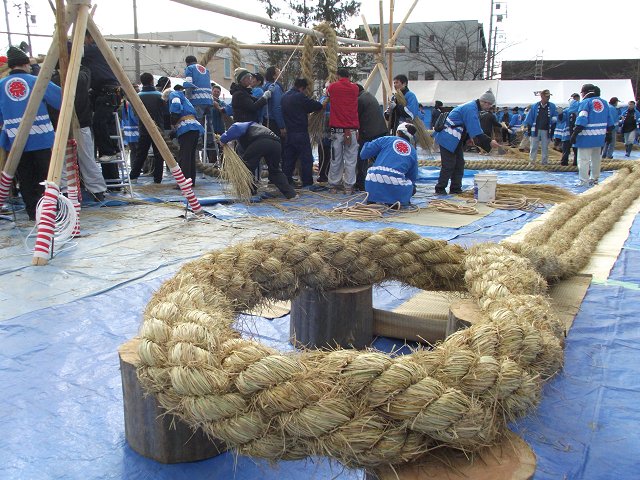12日付長野日報によれば、地元住民有志でつくる「四王藁の会」のみなさんが区内の田んぼで育てた2年分の麦わら3000束(セキトリ使用)が使われ、仕上げられた元綱(女綱)は長さ約34m、太さ約30cm、重さは1トンにもなったそうです。