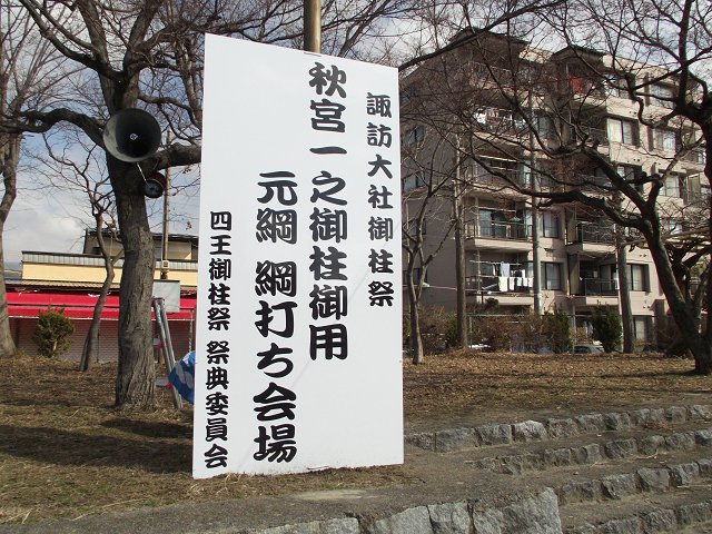 (写真:下諏訪町の四王公園で行われた秋宮一之御柱の元綱の「綱打ち」=12日午前撮影、640×480拡大可能)