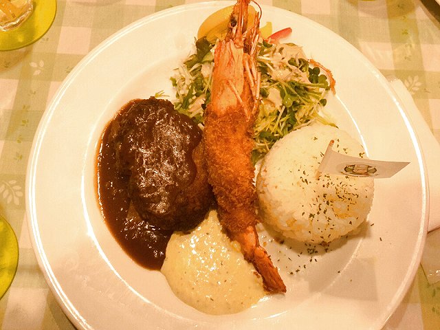 気さくなマスターから今日のおススメをお聞きし、先ずは「小えびと野菜のペペロンチーノ」のダブルと、「オリエンタルチキンサラダ」を注文。後は個人でどうぞ、ということで、管理人は大きな海老がウリの「ジャンボエビフライ&ハンバーグ」(写真)と、デザートに「モカパフェ」をいただきました。