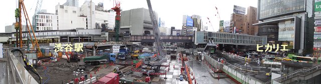 渋谷駅に降りて先ず感じたのは、駅周辺で行われている再開発事業の規模が予想以上のもので、まるで日本中の資源(資材・人材)が全てここに投入されているのではないか、と思わせるものだったこと。渋谷駅東口の東急文化会館は姿を消し、その跡地には「渋谷ヒカリエ」という名称の高層ビル(パノラマ写真右)が建ち、「東急のれん街」のあった東急百貨店(パノラマ写真左の白い建物)は解体まっただ中。西口も同様で、あの忠犬ハチ公様も何処かに移され、残念ながら姿を見ることができませんでした。