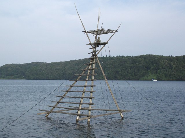 ぼら待ち網漁は、江戸時代から伝わる原始的な漁法で、七、八メートルの丸太ヤグラを組み、その上から海底に張ったフクロ網を見張る、ボラの群れが網に入ると網口の網をたぐり上げて獲るというのんっびりした手法です。