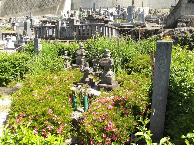 | <写真説明>手前が信州諏訪・上原城主諏訪頼重の墓、左奥に武田信玄の長男・義信の墓、石柱に囲まれた墓地は甲府藩主を務めた柳沢吉保の子息二人の墓 | |