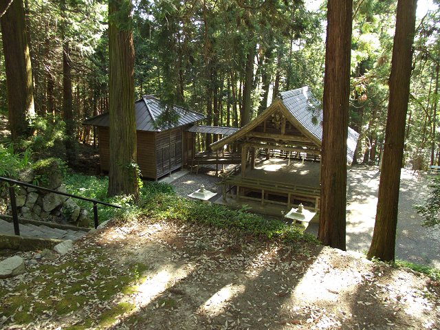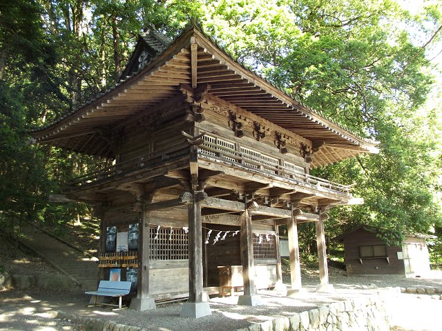 石造明神鳥居。大きな亀腹(礎石)上に立つ柱には、二葉町志田の船形神社のそれと同様、見た目には胴張えい(エンタシス)のごとくに感じられ、しかもがっちり太く(径〇.四六メートル)これに比して柱上には台輪をはさんで置かれた幅の狭い鳥木や笠木は程よい真反りを示し、両端の切り方も内斜ではあるが後世のものほど極端でなく、増しも軽妙である。鳥居の貫に天正一二年(補修)の銘があり、峡北地方の中世造営の鳥居の特徴を備えている。石垣は正面神社参道から鳥居を迂回して石階をつくる特殊な形態を呈し、石積技術も優れ貴重なものである。