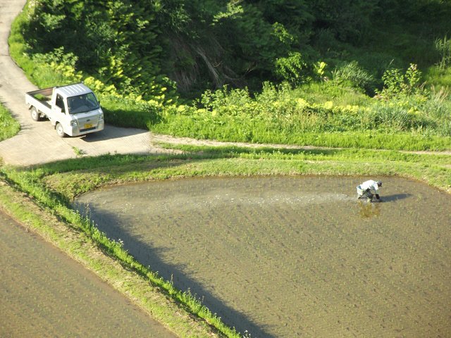 宝渓谷にある棚田では、農家の方がひとつひとつ手作業で田植えの最中。