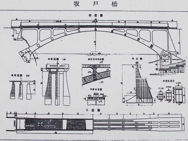 坂戸橋は昭和8年(1933年)に開通して鉄筋コンクリート造りのアーチ橋で、完成当時この弘三としては日本一の規模を誇りました。それまでの鉄筋コンクリートアーチ橋の最大支間長(アーチが跨ぐ幅)は昭和6年竣工の山梨県祝橋の51.5メートルでしたが、これを一気に20メートル近く伸ばした画期的なものでした。その後、岐阜県大牧橋や東京都万年橋がこの記録を上回りましたが、これらの橋は湖底に沈んだり、撤去されたため現存する戦前の鉄筋コンクリートアーチ橋としては、最大スパンとなっています。