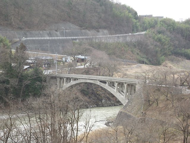 上伊那郡中川村(地図)の天竜川に架かる昭和8年開通の鉄筋コンクリート造アーチ橋。平成22年1月15日国登録有形文化財に登録。春はサクラの名所。