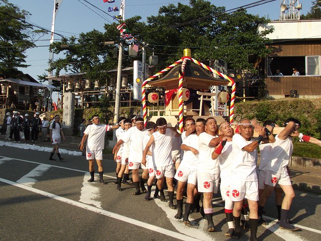 午後5時。神事を終えた神輿が神社を出発。村内の家々を巡り、午後9時過ぎに神社到着。祭りが最高潮を迎えるのはご神体を神社に戻した後の午後10時頃から。担ぎ手たちによって境内階段まで運ばれた神輿は、高々と持ち上げられ投げ落とされます。