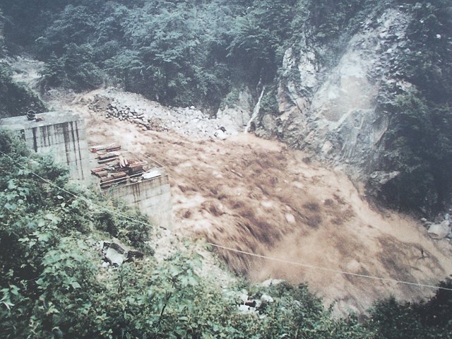 昭和60年に起きた土石流の様子 (案内板から) |