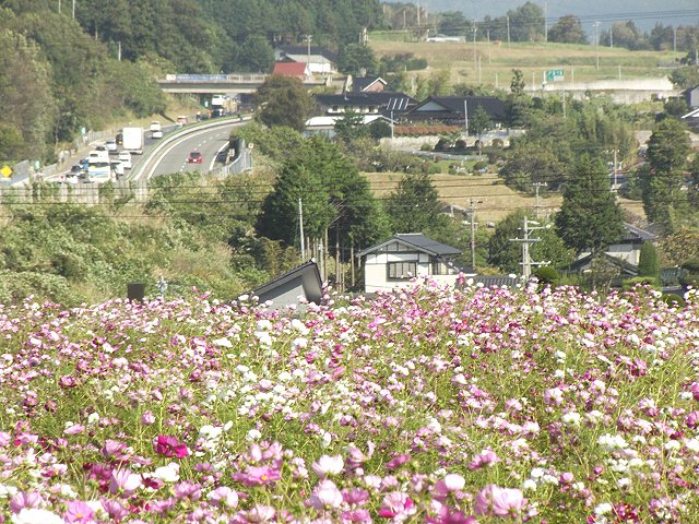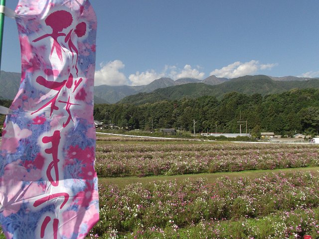 上伊那郡飯島町飯島のJA上伊那飯島果実選果場(地図)では、12日と13日の両日、恒例の秋桜(コスモス)まつりが開催されています。信州最大級ともいわれる200万本の秋桜が、青い空と中央アルプスを背景に可憐な花を咲かせています。入場無料。