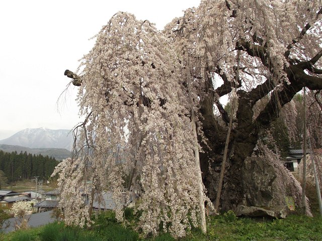 上水内郡飯綱町地蔵久保のオオヤマザクラと袖之山のシダレザクラの様子。