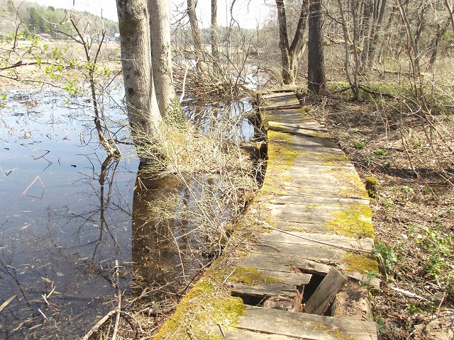 大久保池のミズバショウ群生地までは整備された木道を歩きますが、長年の風雪の影響からか、木道の継ぎ目が外れ落下していたり、板が折れる(写真右下)など、荒廃が進んでいるように感じました。