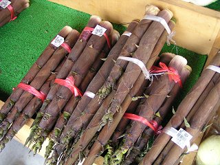 写真の淡竹は、8日、小川村の道の駅にある農産物直売所「さんさん市場」で販売されていたもので、ひと束350円也。地元の方にお聞きすると、鮮度の見分け方として、①切り口が白いこと、②切り口部分が水で滴っていること、などなど教えてくれました。なるほどなぁ。