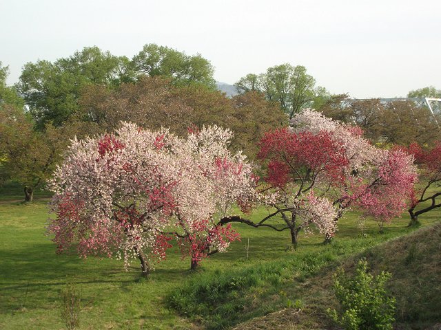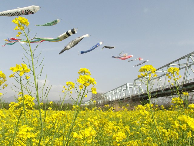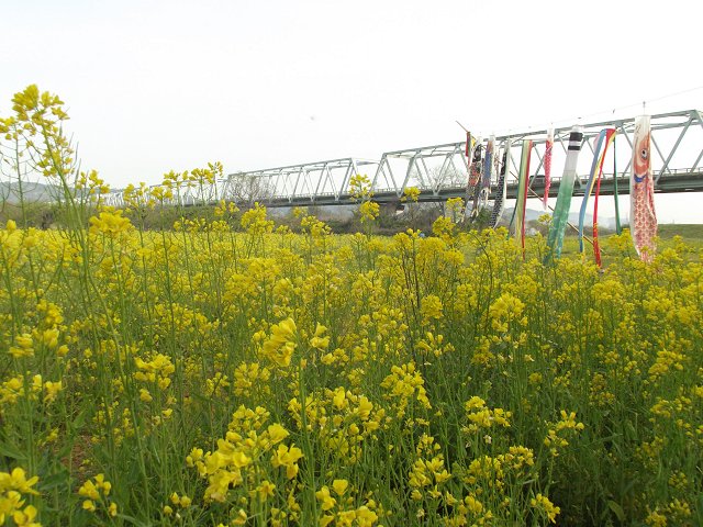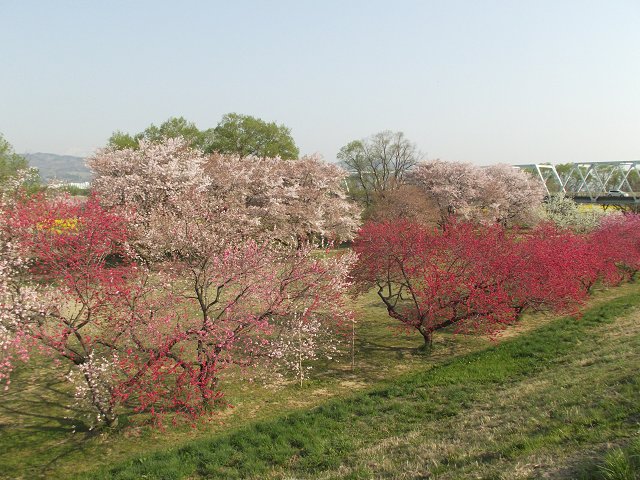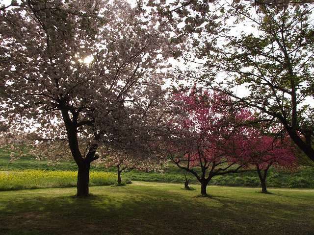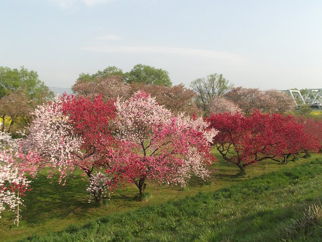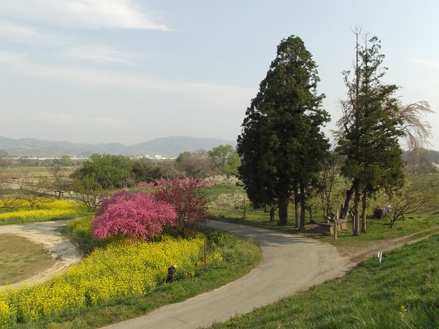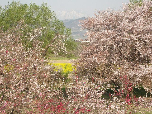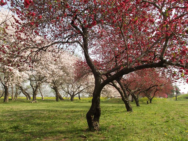 上高井郡小布施町の千曲川ふれあい公園(地図)は、色鮮やかなハナモモと黄色の絨毯が眩しい菜の花、千曲川堤防・桜堤のヤエザクラの競演が知られています。