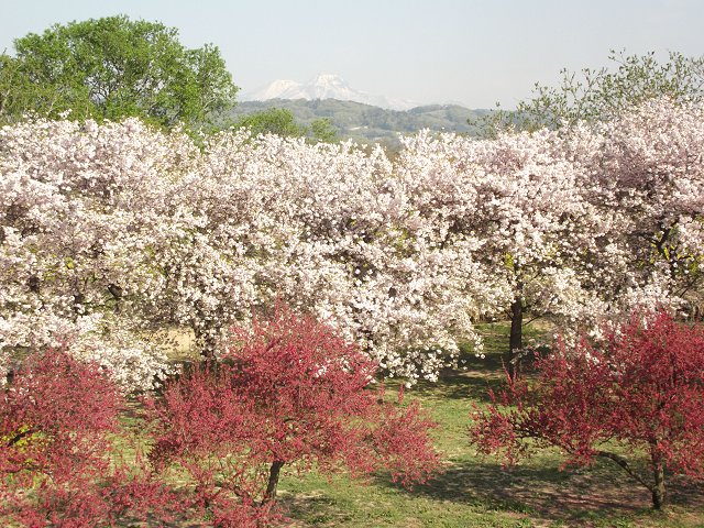 上高井郡小布施町の千曲川ふれあい公園(地図)では、色鮮やかなハナモモと黄色の絨毯が眩しい菜の花、例年はそれよりやや遅れて咲く千曲川堤防・桜堤のヤエザクラが一斉に満開となり、春花の競演を楽しむ大勢の観光客で賑わっています。