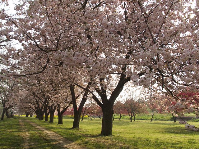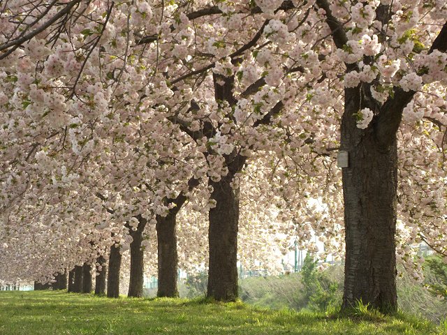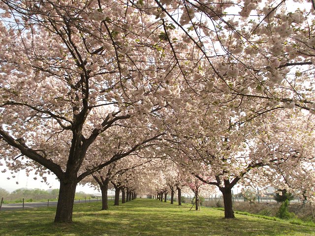 桜堤の桜並木は、上高井郡小布施町の千曲川ふれあい公園(小布施橋)から中野市立ヶ花まで続くもので、全長4キロの堤防沿いに約600本のヤエザクラ(遅咲きの「一葉」という品種)が咲くことで知られています。