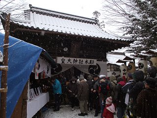 | 参拝者で賑わう皇大神社 | 縁起物を販売する露店 |