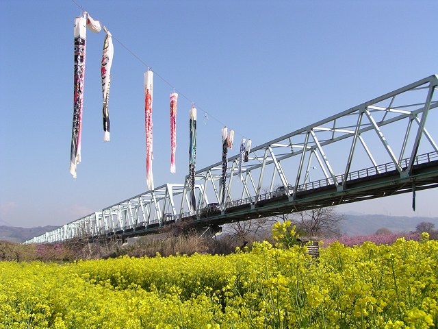 | 鯉のぼりも泳ぐ菜の花畑では黄色の菜の花が満開 (クリックで拡大可能) |
