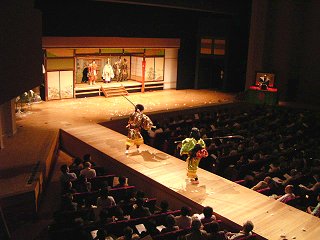 長野県県民文化会館中ホールで14日午後、下伊那郡大鹿村に伝わる伝統芸能で、国選択無形民俗文化財の「大鹿歌舞伎」の公演が行われ、代表作として知られる「六千両後日之文章 重忠館之段」が演じられました。 (写真=14日撮影)