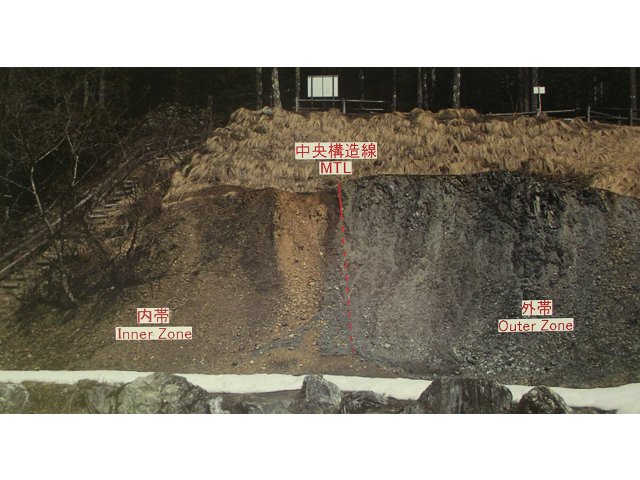 写真では、案内図にある地層の写真を参考に中央構造線の位置(三波川変成帯の左端)を示しています。