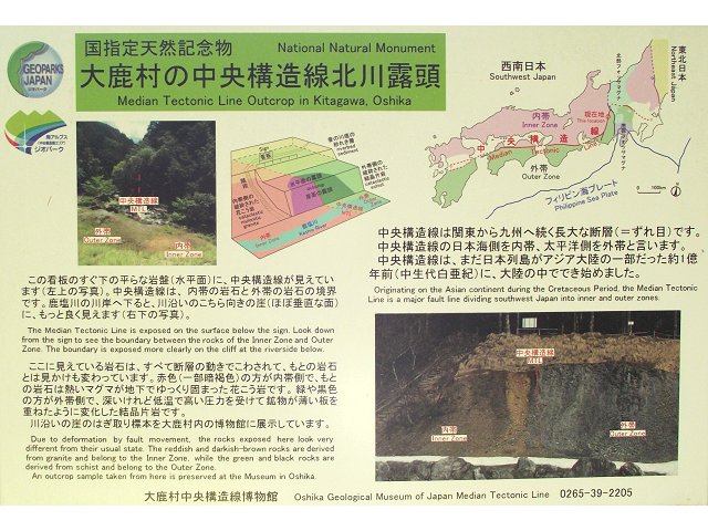 長野県南部を縦断する中央構造線は、埋って確認できない関東や九州と異なり、西南日本内帯(領家変成帯)と西南日本外帯(三波川変成帯)が接する状況が確認できる場所(露頭)が幾つかあり、下伊那郡大鹿村北川(地図)では、国指定天然記念物の北川露頭( Wikipedia )を見学することができます。