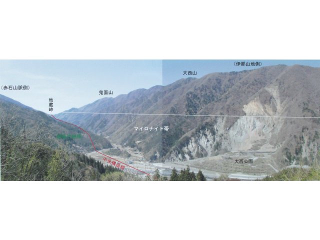 今の地形をつくっている近く変動は約200万年前に始まりました。赤石山脈と伊那山地(伊那山脈)は1年に数mmの速さで隆起しています。隆起地塊の中を通る中央構造線の弱線が侵食され、両側から岩盤が崩れて断層沿いに谷がつくられています。大西公園から赤石岳を見通せる一直線の谷も小渋断層沿いの谷です。