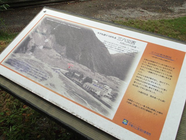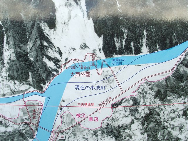 | 災害当時の状況 | 大西山崩壊を伝える案内板 |