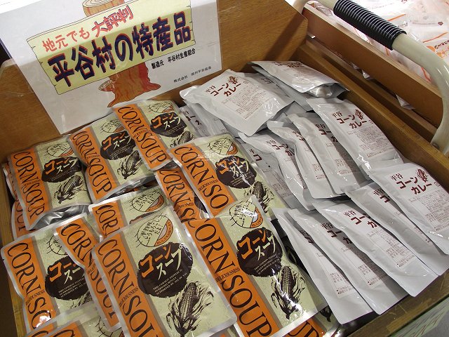 下伊那郡平谷村(地図)では、昼夜の寒暖差が大きい平谷高原の気候を利用したとうもろこしの栽培が盛んですが、その平谷産とうもろこしを使ったコーンスープは観光客にも人気の逸品であり、今では村の名物として知られるまでになっています。平谷村産とうもろこし98.8%使用して作られたレトルトタイプのこのコーンスープ。1袋(180グラム)200円(ひまわりの湯売店)とお手軽な値段で購入でき、開封前であれば常温で1年間、濃厚な甘さのまま保存できることが人気のヒミツなのかもしれません。