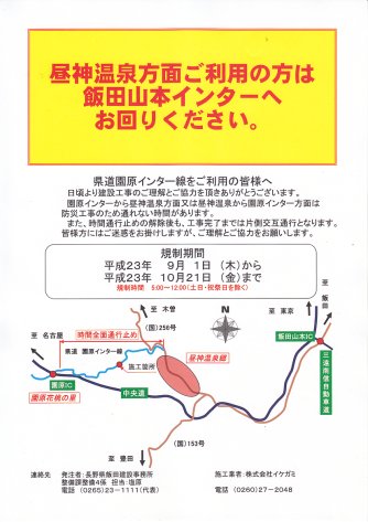 中央道園原ICと昼神温泉郷を結ぶ県道園原インター線(地図)が、平成23年9月1日(木)から10月21日(金)まで(規制時間:午前5時から正午まで・土日祝祭日を除く)、防災工事のため時間通行止めが行われます。時間通行止めが解除された後も工事完了までは片側交互規制となるようです。