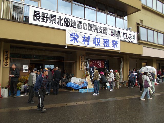 下水内郡栄村の栄村役場前広場で28日、恒例の栄村収穫祭が開催され、生憎の雨降りにもかかわらず、地元住民や近隣から訪れた人たちで賑わいました。