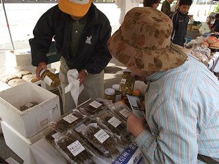 この収穫祭の会場では、毎年、村に住むあるおじさんが農業の合間に手づくりしたという「またたび」の瓶詰めを販売されていて、これを買うことが我が家の楽しみになっています。今年もおじさん、お店を開いているかなぁ…と思いつつ、会場内を探すと、いつもと同じ場所で、村の特産として知られる「行者ニンニク」の横に、おじさんは黙々とその「瓶詰めまたたび」を机の上に並べているところでした。