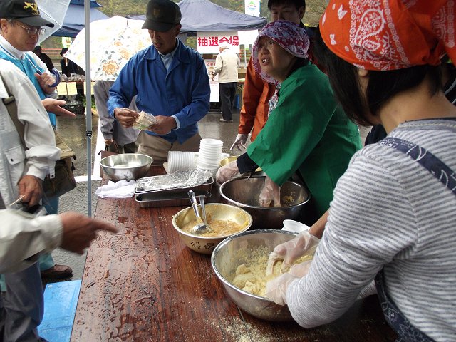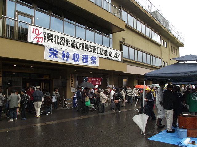 下水内郡栄村の栄村役場前広場で18日、恒例の収穫祭が開催され、村内外から訪れた大勢の人たちで賑わいました。