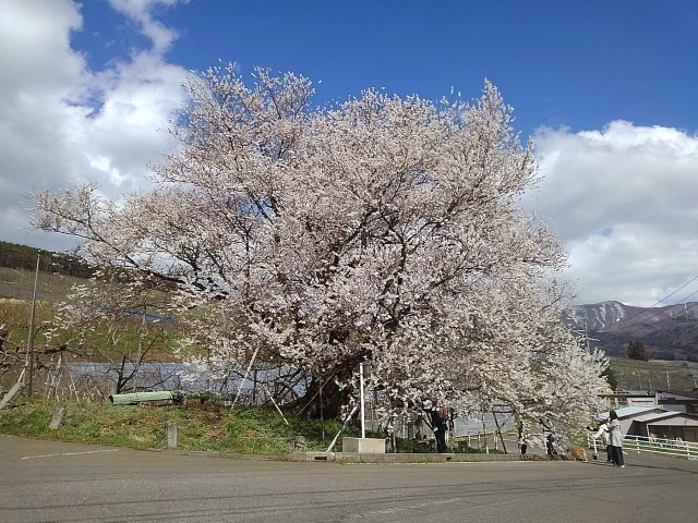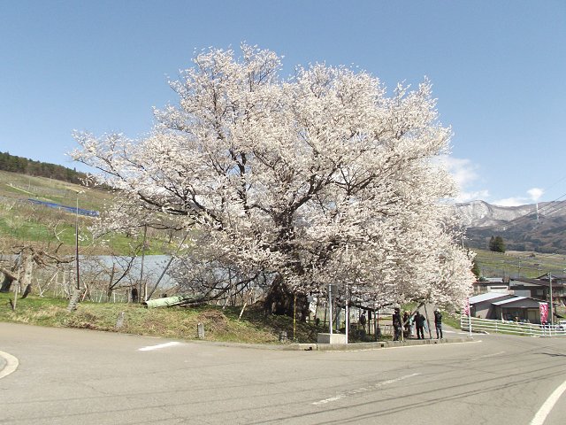 下高井郡山ノ内町夜間瀬宇木地区(地図)に咲く、満開の県天然記念物「宇木のエドヒガン」の様子。