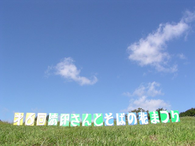 下高井郡山ノ内町須賀川の八丁原(地図)では、20日と21日の2日間、恒例の法印さんとそばの花まつりが開催されています。まつりは、須賀川そばをPRするため毎年行われているもので、快晴となった20日は、満開のそば畑をトラクターで一周するそば畑巡りや法印さんにまつわる紙芝居が披露されたほか、ヤマゴボウ(オヤマボクチ)の葉をつなぎに使った「須賀川そば」(600円)などが販売され賑わいました。まつりは21日も午前9時30分から午後3時半まで行われています。 (写真=20日撮影、640×480拡大可能)