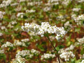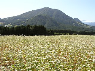 | 高社山を背景に広がるそば畑 | 満開のそばの花 |