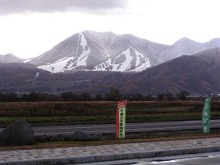 写真は、飯山市常盤の道の駅「花の駅・千曲川」から撮影した高社山の様子。