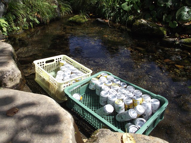 水汲みに出かけてみると、湧水が流れる小池にカゴが置かれ、たくさんのビール缶が冷やされていました。公民館で催しが行われているようでしたので、集まった地域の人たちへの差し入れだったのかもしれません。真夏でも手がイタくなるほど冷えた龍興寺清水。名水で冷やされたビールのお味は、さて如何に?