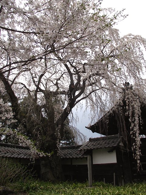中野市赤岩にある曹洞宗谷厳寺(地図)の境内に咲くシダレザクラ。