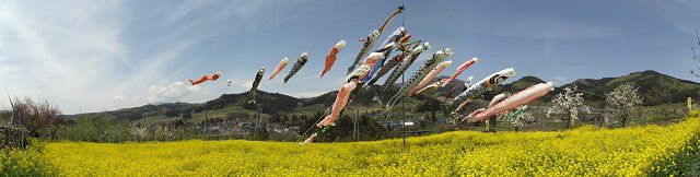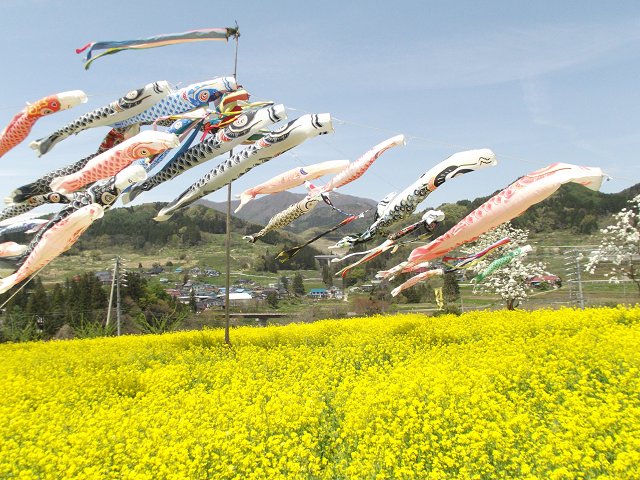 晴天に恵まれた6日は、菜の花畑の上を爽やかな風を受けて、元気に泳ぐ鯉のぼりの姿が見られました。