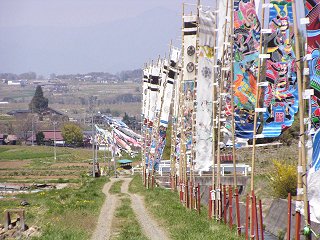 また、津金寺前を流れる番屋川沿いの農道では、地元立科町山部の地域おこしグループ「山部十人会」の皆さんが飾った武者のぼりと鯉のぼりが泳いでいました。飾りは4日まで掲げられているそうです。