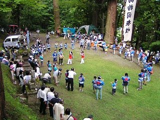 神前に奉納される「狂拍子(くるんびょうし)」と「奴(やっこ)踊り」は県の無形民俗文化財指定の民俗芸能。 (写真=平成18年8月27日撮影)