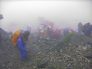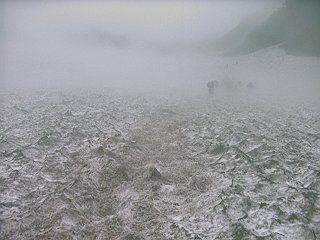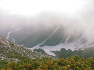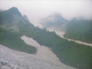 この「葱平」、晴れていれば稜線が見渡せる景色の良い場所らしいのですが、管理人が登った時のように、雨降りともなると数メートル先すら見えない状況(参考・写真右下:大雪渓終点の葱平付近)に一変。足元だけに気を取られ、とても落石に注意を払うところまでいかなかったように思います。しかも今回は、これまで報道されたところでは、<稀に起きた地滑り>だったということですから、例えベテランのガイドさんであっても予見することは不可能だったのではないでしょうか。