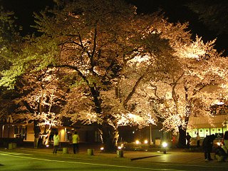 塩尻市のレザンホール前(地図)に咲くソメイヨシノが満開となり、ライトアップされたサクラを楽しむ市民で賑わっています。(写真=16日午後8時20分)
