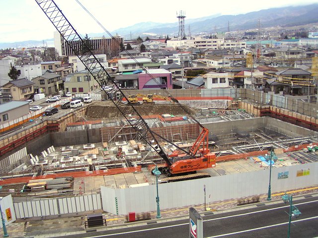 写真は、市営駐車場から撮影した塩尻市大門中央通り地区市街地再開発ビル・えんぱーくの建設工事現場の様子です。再開発ビルの完成は平成22年春を予定。完成後は市民交流センターなどが入居することとなっています。